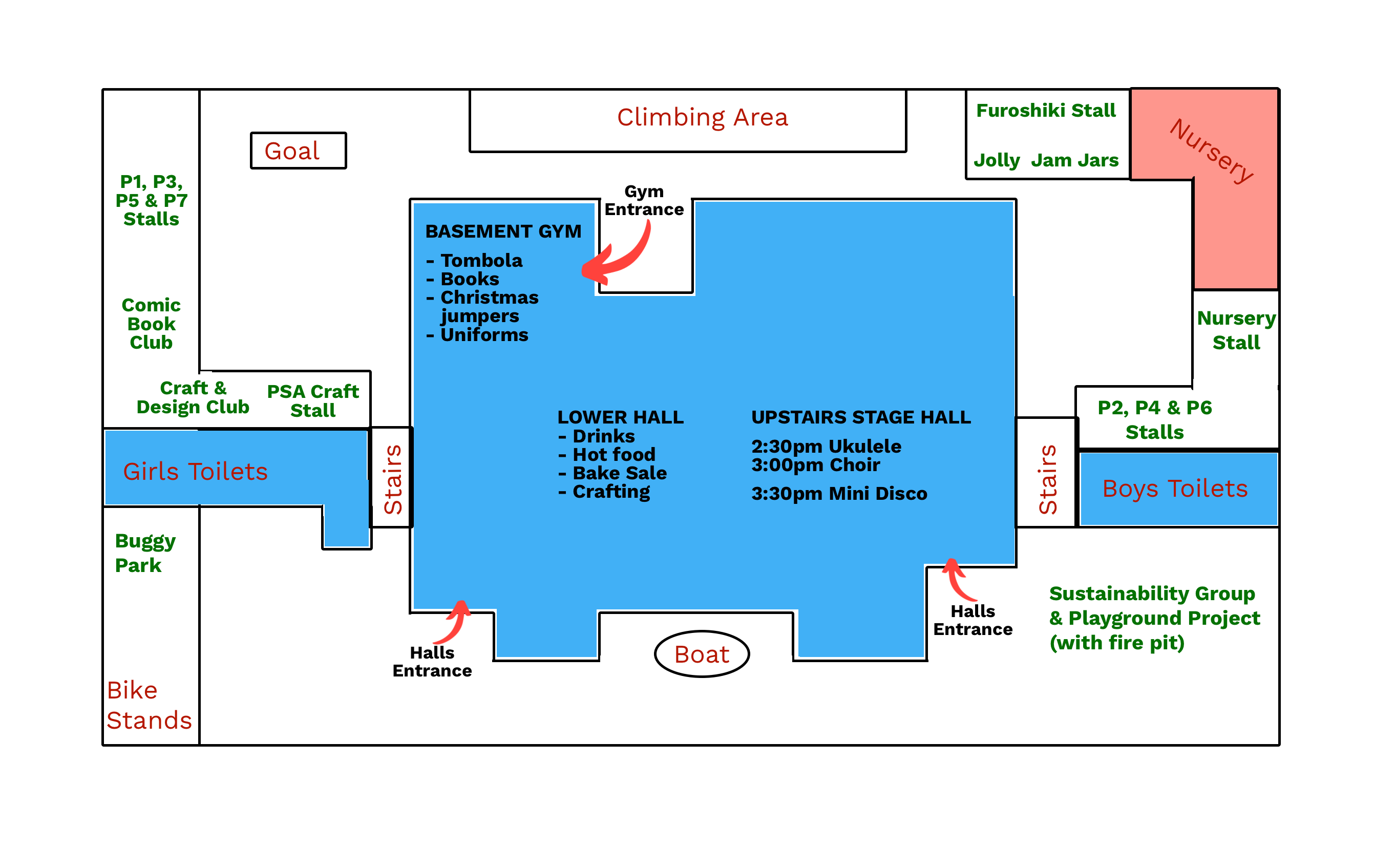 Lower playground (under the shelters): Jolly Jam Jars; Market stalls (including P1 – P7 year group stalls; Comic Book Club; Craft & Design Club; Furoshiki Stall; PSA Craft Stall; Nursery Stall)