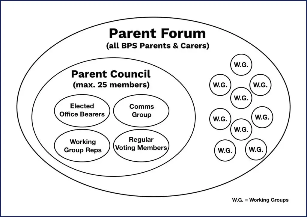 We also have a number of Working Groups, which sit within the Parent Forum. Each Working Group nominates a representative, who has a vote on the Parent Council.